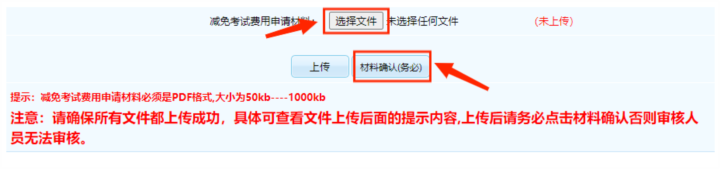 3.上傳最低生活保障家庭人員證明材料(材料要求:低保證或家庭所在地的民政部門(mén)出具的城鄉(xiāng)低保證明的掃描件,需在材料空白位置注明報(bào)考者姓名、證件號(hào)碼和聯(lián)系電話)。證明材料上傳成功后,點(diǎn)擊“材料確認(rèn)(務(wù)必)”按鈕。