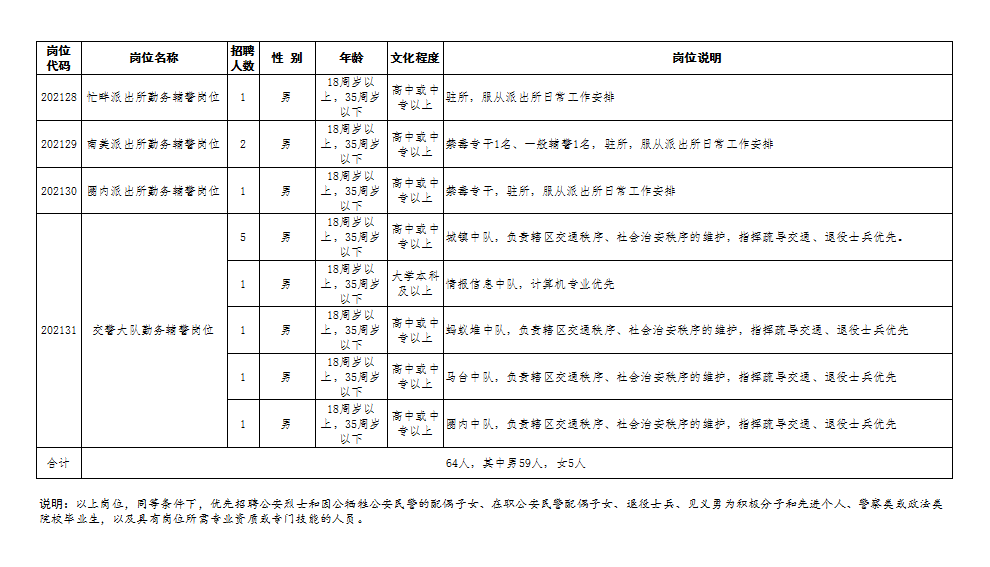 1、招聘名額:64名(男性59名,女性5名),具體崗位詳見招錄計劃表。