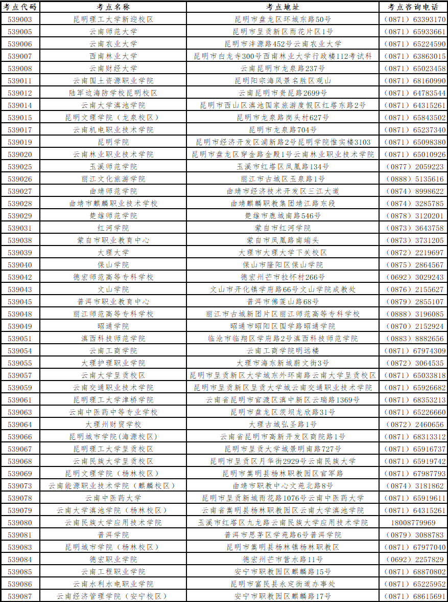 注:本次考試云南中醫(yī)藥中等專業(yè)學(xué)校、云南工程職業(yè)學(xué)院、昆明城市學(xué)院(楊林校區(qū))3個考點(diǎn)接受社會考生報考,其他考點(diǎn)只接受本校在校生報考。