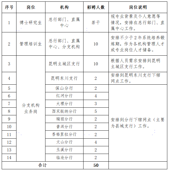 富滇銀行以發(fā)展為第一要?jiǎng)?wù),圍繞全行重點(diǎn)戰(zhàn)略部署著力優(yōu)化人才結(jié)構(gòu)、人才布局、人才生態(tài),以人才為第一資源,以創(chuàng)新為第一動(dòng)力,深入實(shí)施新時(shí)代人才強(qiáng)行戰(zhàn)略。為進(jìn)一步強(qiáng)化高質(zhì)量發(fā)展的人才支撐,現(xiàn)啟動(dòng)2024年校園招聘,誠(chéng)邀充滿青春活力的你,讓我們?nèi)σ浴案弧,“滇”燃未?lái)!
