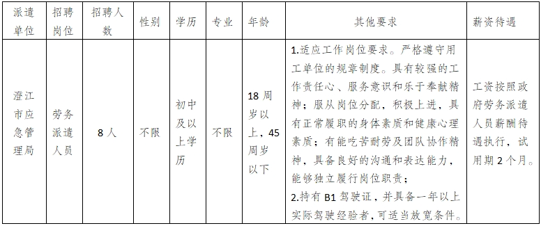 澄江市應急管理局因工作需要,委托澄江市啟澄人力資源有限責任公司面向社會公開招聘政府專職消防員8名,招聘相關事項如下: