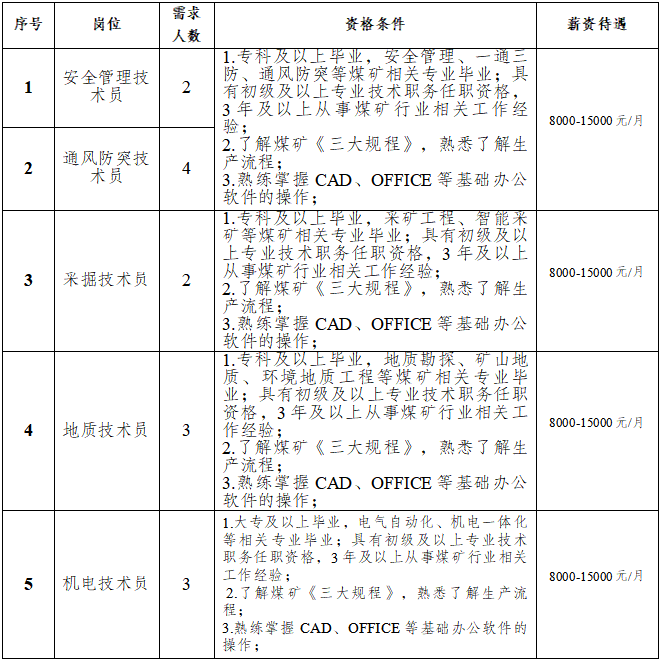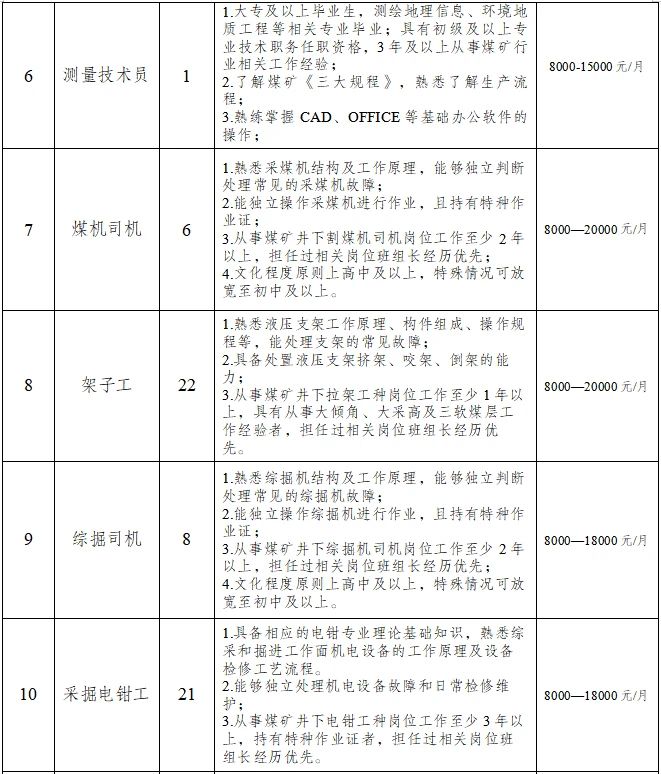 原則上年齡一般不超45周歲,特殊崗位技術(shù)人才可適當(dāng)放寬年齡至50周歲以內(nèi),但需個人確保到齡退休時,養(yǎng)老保險繳費年限符合退休條件;持有井下相關(guān)操作技能等證書優(yōu)先考慮;身體健康,無相關(guān)職業(yè)禁忌癥。