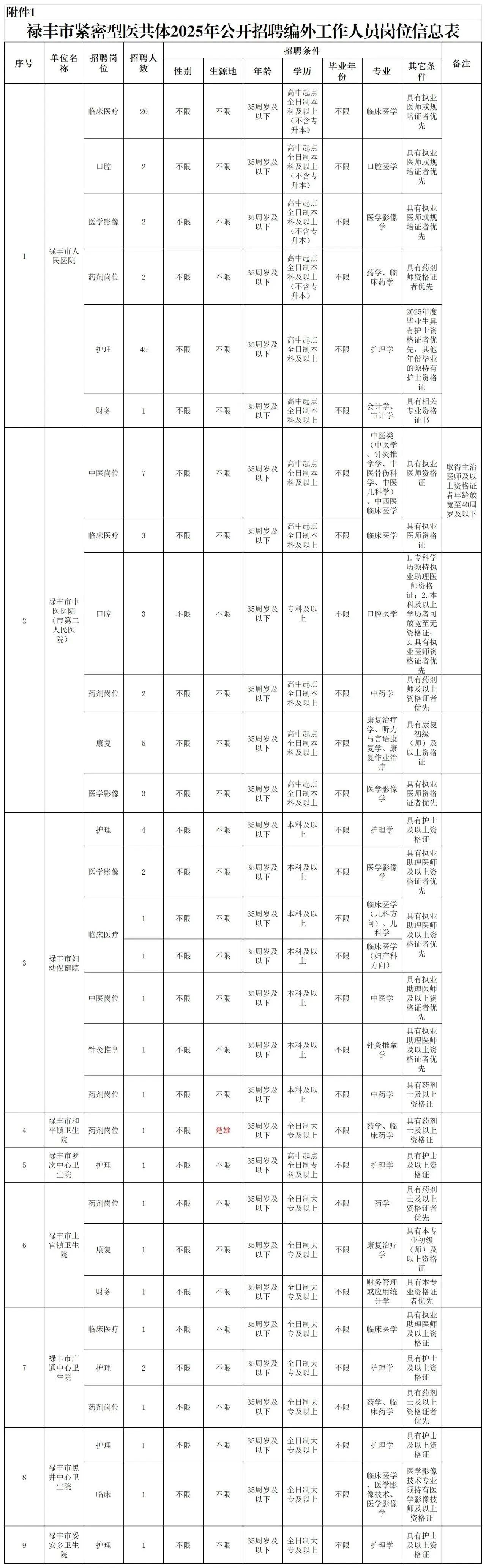 招聘的具體崗位、人數(shù)、資格條件等詳見崗位信息表《祿豐市緊密型醫(yī)共體2025年公開招聘編制外工作人員崗位信息表》(附件1)。