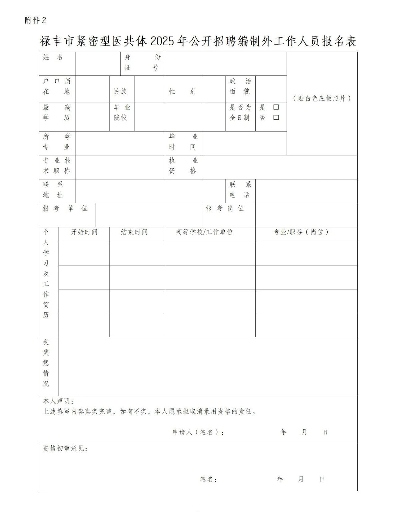 2. 祿豐市緊密型醫(yī)共體2025年公開招聘編制外工作人員報(bào)名表