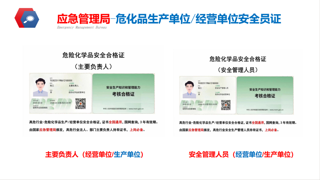 危險化學(xué)品生產(chǎn)/經(jīng)營單位主要負責(zé)人:適用于危險化學(xué)品生產(chǎn)企業(yè)和經(jīng)營單位,由應(yīng)急管理局頒發(fā),證書全稱:危險化學(xué)品經(jīng)營單位(主要負責(zé)人)和危險化學(xué)品生產(chǎn)單位(主要負責(zé)人),危險化學(xué)品的生產(chǎn)、經(jīng)營、儲存、運輸、使用以及處置廢棄;坊顒拥娜藛T,必須接受有關(guān)法律、法規(guī)、規(guī)章和安全知識、專業(yè)技術(shù)、職業(yè)衛(wèi)生防護和應(yīng)急救援等知識的培訓(xùn),并經(jīng)考核合格,方可上崗作業(yè)。