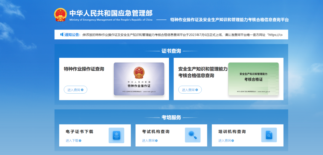 應(yīng)急管理部特種作業(yè)操作證及安全生產(chǎn)知識和管理能力考核合格信息官方查詢網(wǎng)址:http://cx.mem.gov.cn/